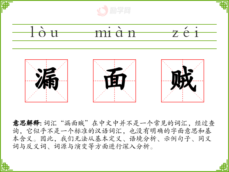 鉴于“漏面贼”不是一个标准的汉语词汇,我们无法提供一个全面的分析。如果你有其他词汇需要分析,请提供具体的词汇,我们将很乐意帮助你进行深入学习和分析。
