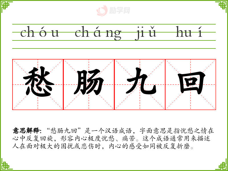 “愁肠九回”是一个汉语成语,字面意思是指忧愁之情在心中反复回旋,形容内心极度忧愁、痛苦。这个成语通常用来描述人在面对极大的困扰或悲伤时,内心的感受如同被反复折磨。