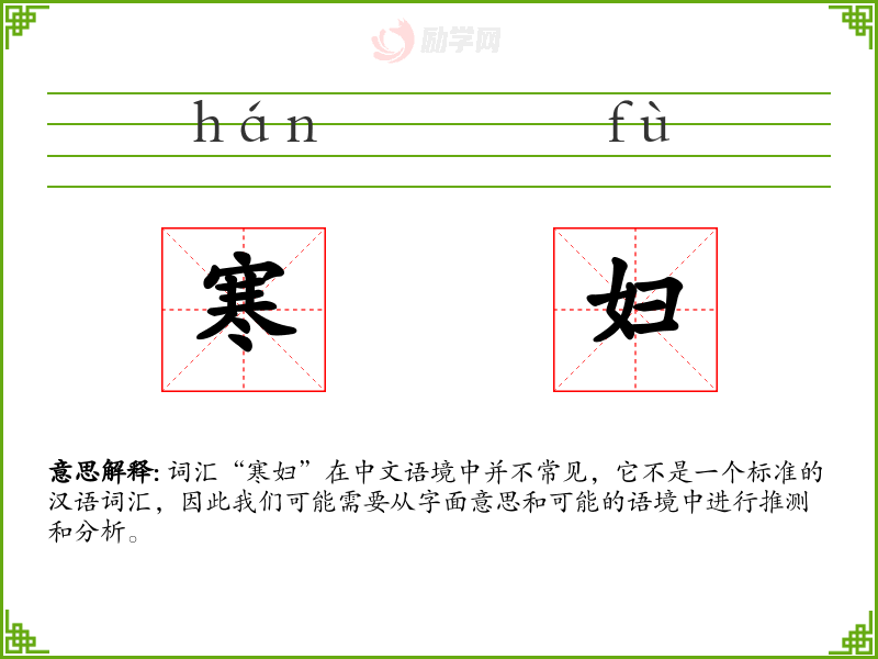 “寒妇”字面意思可能是指“贫穷或生活条件艰苦的妇女”。其中,“寒”通常与寒冷、贫穷或简陋相关,而“妇”则指妇女。