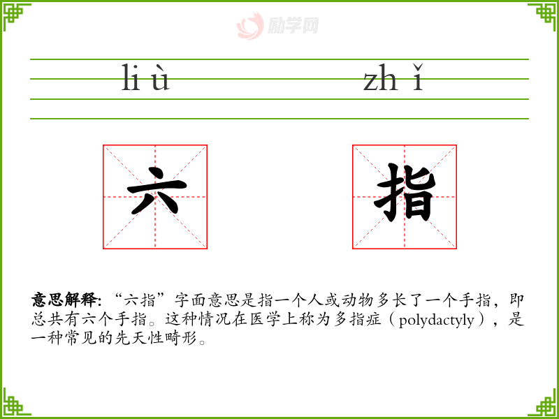 “六指”一词直接来源于汉语,描述的是一个具体的生理现象。在语言演变中,这个词主要用于描述和讨论与多指症相关的话题。