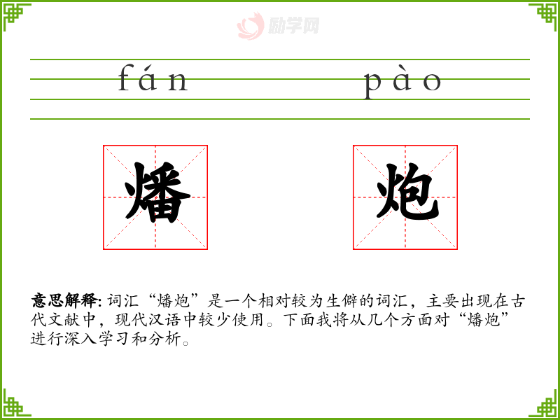 词汇“燔炮”是一个相对较为生僻的词汇,主要出现在古代文献中,现代汉语中较少使用。下面我将从几个方面对“燔炮”进行深入学*和分析。