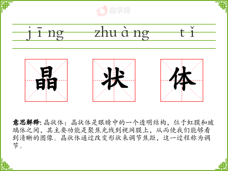 - 理解:晶状体是眼睛中至关重要的结构,对保持良好视力至关重要。