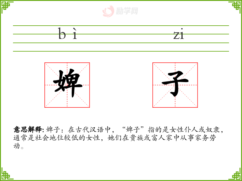 婢子:在古代汉语中,“婢子”指的是女性仆人或奴隶,通常是社会地位较低的女性,她们在贵族或富人家中从事家务劳动。