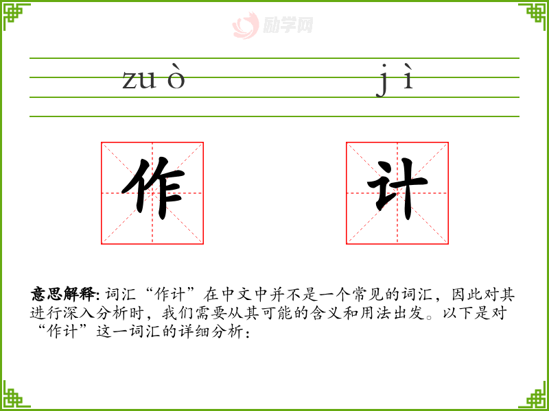 词汇“作计”在中文中并不是一个常见的词汇,因此对其进行深入分析时,我们需要从其可能的含义和用法出发。以下是对“作计”这一词汇的详细分析:
