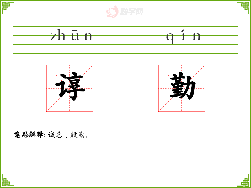 《说文》-勤,劳也。 《诗·周颂·赍》-文王既勤止。 《礼记·玉藻》。注:“执劳辱之事也。”-勤者,有事则收之。 《书·天逸》-厥父母勤劳稼穑。 《楚辞·天问》-何勤子屠母,而死兮竟地? 宋·司马光《训俭示康》-会数而礼勤。 明·宋濂《送东阳马生序》-勤且艰若此。 《明史》-忧勤国事。 《国语·晋语》-好学而不勤问。 《论语·微子》-四体不勤。 《左传·僖公三十二年》-勤而无所。 《玉台新咏·古诗为焦仲卿妻作》-昼夜勤作息。