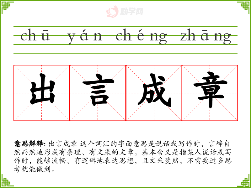 出言成章 这个词汇的字面意思是说话或写作时,言辞自然而然地形成有条理、有文采的文章。基本含义是指某人说话或写作时,能够流畅、有逻辑地表达思想,且文采斐然,不需要过多思考就能做到。