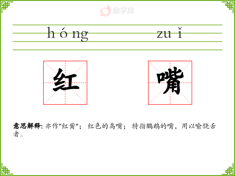 红嘴的意思是:亦作"红觜"; 红色的鸟嘴; 特指鹦鹉的嘴,用以喻饶舌者。