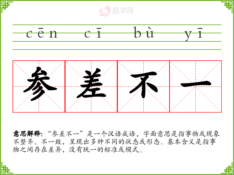 - 反义词:整齐划一、千篇一律、一模一样