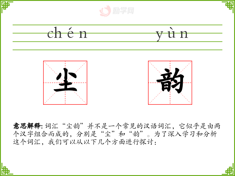 词汇“尘韵”并不是一个常见的汉语词汇,它似乎是由两个汉字组合而成的,分别是“尘”和“韵”。为了深入学*和分析这个词汇,我们可以从以下几个方面进行探讨: