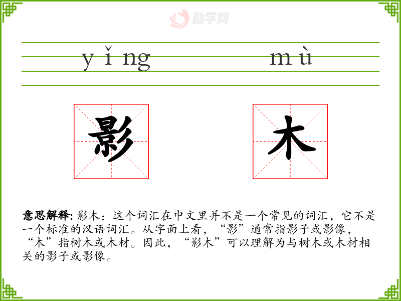 由于“影木”不是一个标准词汇,它在不同的语境中可能没有固定的使用方式。在某些特定的文学作品或专业领域中,如果出现这个词汇,可能需要根据上下文来理解其具体含义。
