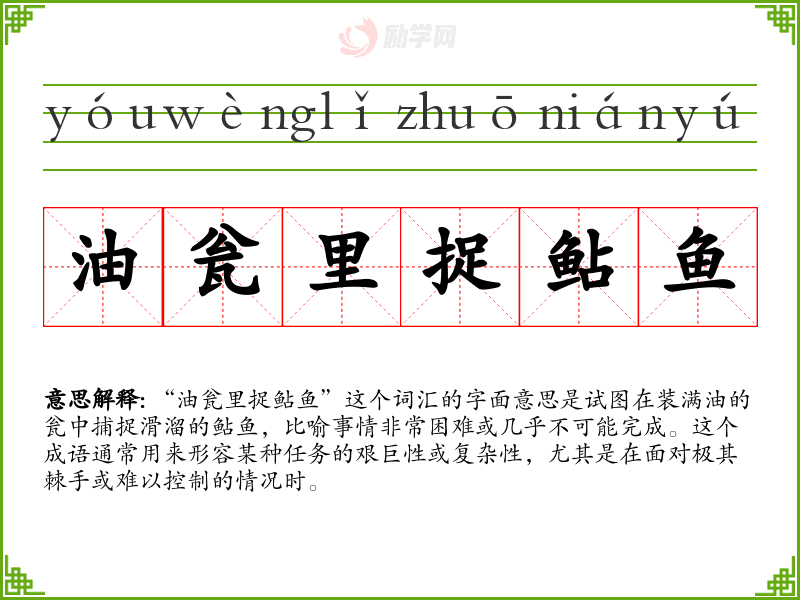 “油瓮里捉鲇鱼”这个成语不仅形象地描述了任务的困难,还体现了人们在面对挑战时的态度和智慧。在我的语言学*和表达中,这个成语是一个非常有用的工具,可以帮助我更生动地描述复杂的情况,并传达出一种幽默和坚持的精神。