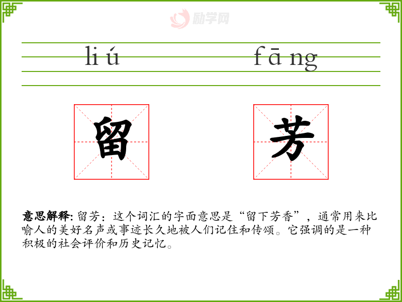 留芳:这个词汇的字面意思是“留下芳香”,通常用来比喻人的美好名声或事迹长久地被人们记住和传颂。它强调的是一种积极的社会评价和历史记忆。