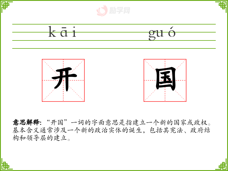 “开国”是一个充满历史和文化意义的词汇,它不仅描述了一个国家的诞生,也象征着新的开始和希望。在我的语言学*和表达中,理解和正确使用这个词是非常重要的,因为它涉及对国家历史和文化的深刻理解。