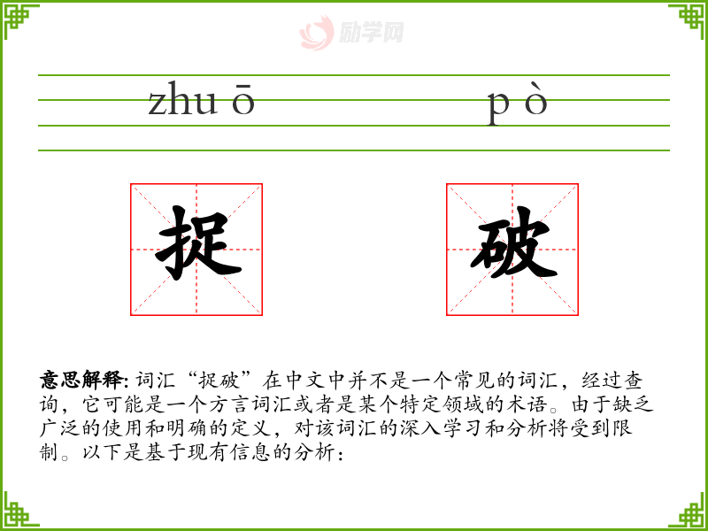 由于“捉破”不是一个常见的标准汉语词汇,对其的深入学习和分析受到限制。在语言学习和表达中,重要的是掌握和使用广泛认可的词汇,以确保沟通的准确性和有效性。对于不明确的词汇,建议寻找更常见的替代词汇或进一步明确其含义和用法。