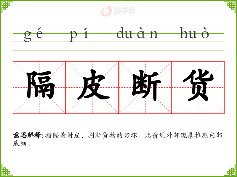 隔皮断货的意思是:指隔着封皮,判断货物的好坏。比喻凭外部现象推测内部底细。