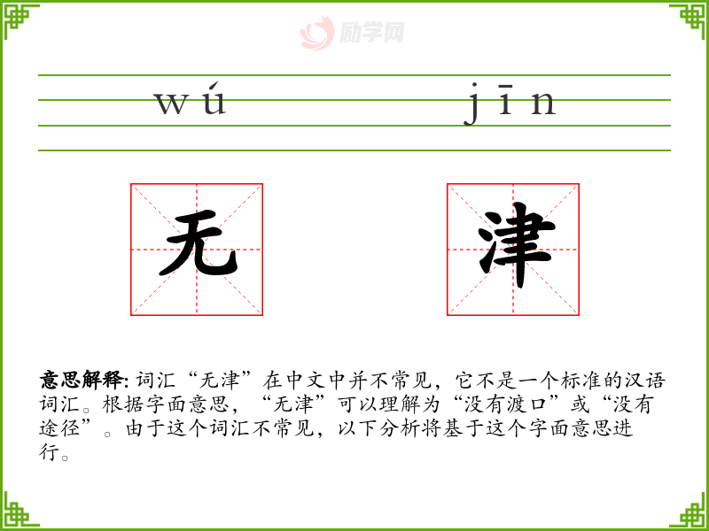 词汇“无津”在中文中并不常见,它不是一个标准的汉语词汇。根据字面意思,“无津”可以理解为“没有渡口”或“没有途径”。由于这个词汇不常见,以下分析将基于这个字面意思进行。