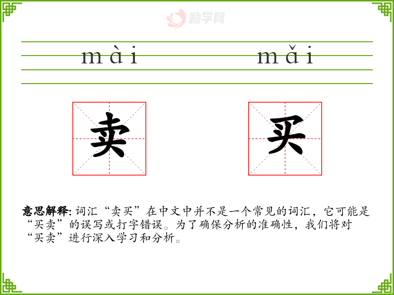 词汇“卖买”在中文中并不是一个常见的词汇,它可能是“买卖”的误写或打字错误。为了确保分析的准确性,我们将对“买卖”进行深入学*和分析。