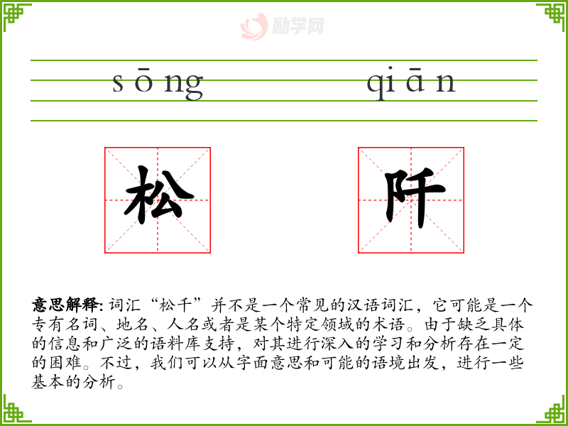 词汇“松千”并不是一个常见的汉语词汇,它可能是一个专有名词、地名、人名或者是某个特定领域的术语。由于缺乏具体的信息和广泛的语料库支持,对其进行深入的学习和分析存在一定的困难。不过,我们可以从字面意思和可能的语境出发,进行一些基本的分析。