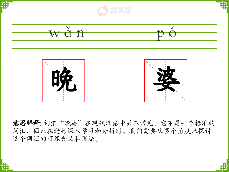 总的来说,“晚婆”这个词汇的含义和用法非常不明确,它可能是一个方言词汇或者特定社群中的俚语。在没有更多上下文和具体实例的情况下,我们无法给出一个准确的分析。在语言学习和表达中,了解和使用标准词汇更为重要,而这类非标准词汇的学习可能需要特定的语境和社群知识。