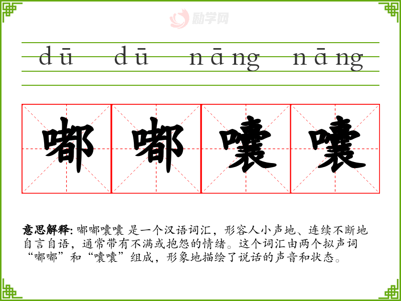 嘟嘟囔囔 是一个汉语词汇,形容人小声地、连续不断地自言自语,通常带有不满或抱怨的情绪。这个词汇由两个拟声词“嘟嘟”和“囔囔”组成,形象地描绘了说话的声音和状态。