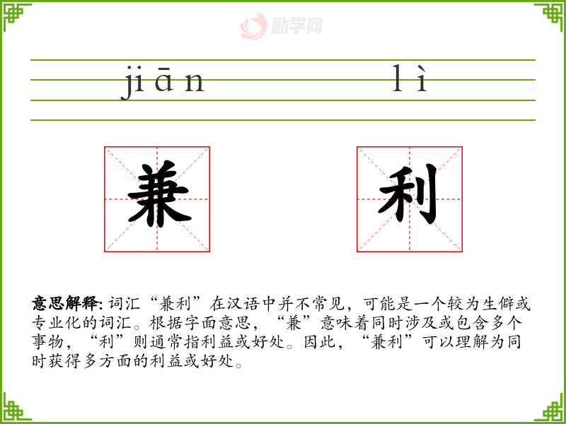 “兼利”是一个富有策略性和效率性的词汇,它提醒我们在决策和行动时考虑多方面的利益,追求最佳的综合效果。在语言学*和表达中,理解和运用这样的词汇可以提升我们的思维深度和表达的丰富性。