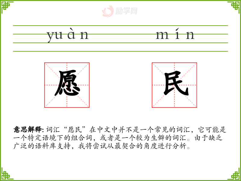 词汇“愿民”在中文中并不是一个常见的词汇,它可能是一个特定语境下的组合词,或者是一个较为生僻的词汇。由于缺乏广泛的语料库支持,我将尝试从最契合的角度进行分析。