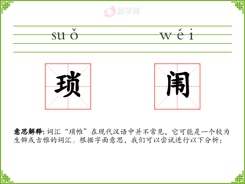 词汇“琐帷”在现代汉语中并不常见,它可能是一个较为生僻或古雅的词汇。根据字面意思,我们可以尝试进行以下分析: