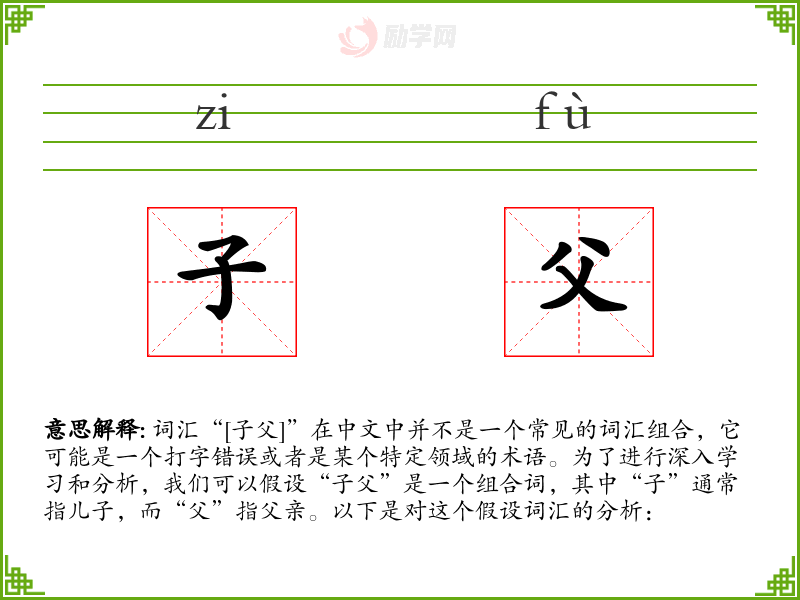 词汇“[子父]”在中文中并不是一个常见的词汇组合,它可能是一个打字错误或者是某个特定领域的术语。为了进行深入学*和分析,我们可以假设“子父”是一个组合词,其中“子”通常指儿子,而“父”指父亲。以下是对这个假设词汇的分析: