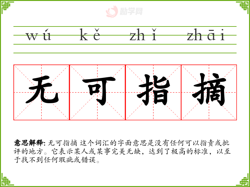 无可指摘 这个词汇的字面意思是没有任何可以指责或批评的地方。它表示某人或某事完美无缺,达到了极高的标准,以至于找不到任何瑕疵或错误。
