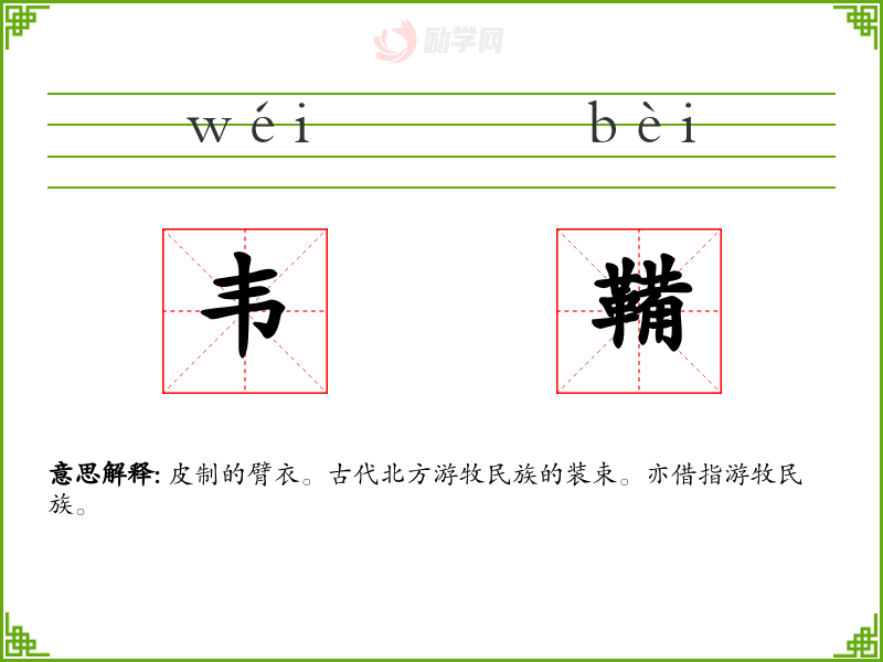 韦鞴的意思是:皮制的臂衣。古代北方游牧民族的装束。亦借指游牧民族。