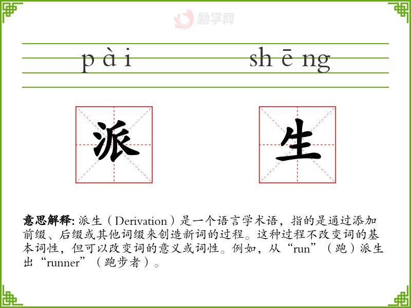 派生(Derivation)是一个语言学术语,指的是通过添加前缀、后缀或其他词缀来创造新词的过程。这种过程不改变词的基本词性,但可以改变词的意义或词性。例如,从“run”(跑)派生出“runner”(跑步者)。