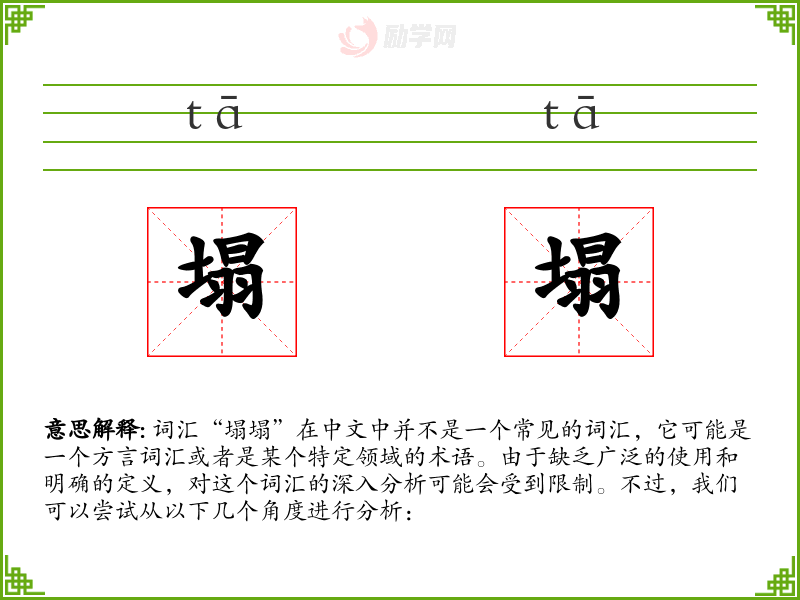 总的来说,“塌塌”这个词汇的分析受到其不常见和定义不明确的限制。如果它是一个方言词汇,了解和学习它可能需要深入到特定的语言环境中。在语言学习和表达中,了解这样的词汇可以帮助我们更好地理解地方文化和语言多样性。