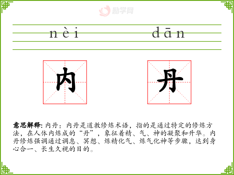 - 专业领域:在道教研究、中医学、气功等领域,内丹是一个专业术语,用于描述特定的修炼方法和理论。
