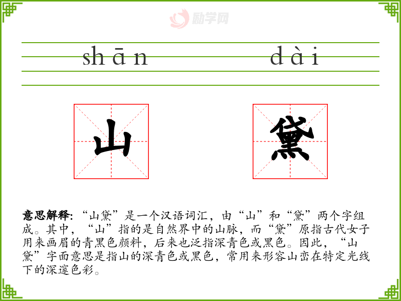 - 反义词:山白(指雪覆盖的山,与山黛的深色形成对比)