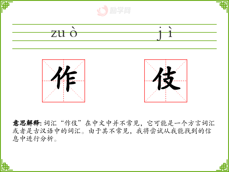 词汇“作伎”在中文中并不常见,它可能是一个方言词汇或者是古汉语中的词汇。由于其不常见,我将尝试从我能找到的信息中进行分析。