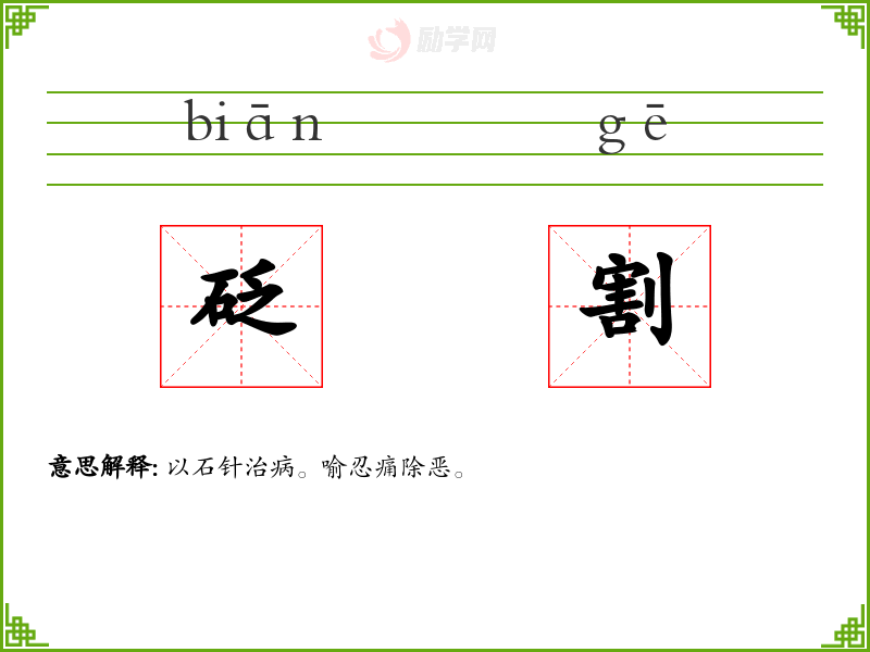 砭割的意思是:以石针治病。喻忍痛除恶。