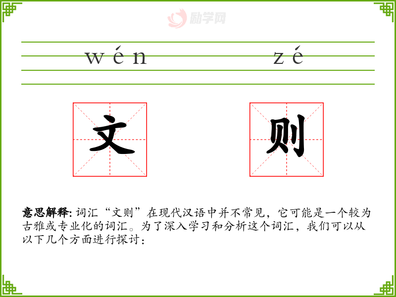 词汇“文则”在现代汉语中并不常见,它可能是一个较为古雅或专业化的词汇。为了深入学*和分析这个词汇,我们可以从以下几个方面进行探讨: