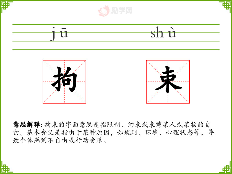 - 文学:在文学作品中,“拘束”常用来描述人物的心理状态,如感到压抑或不自在。