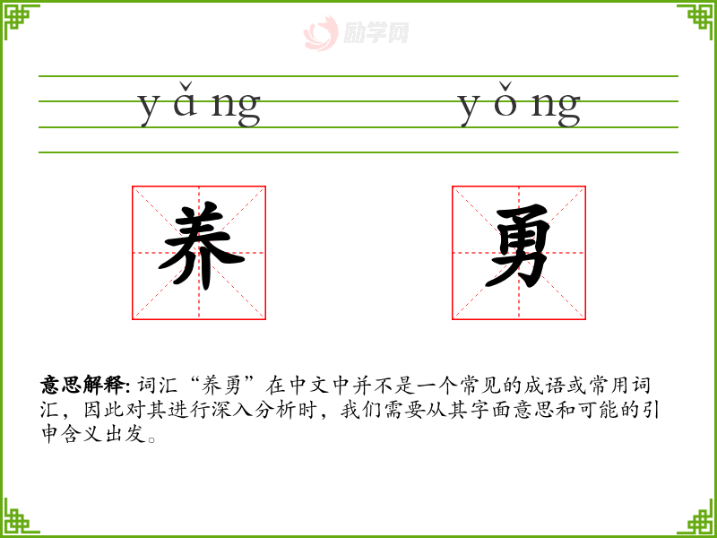 由于“养勇”不是一个常用词汇,它在文学、口语或专业领域中的使用并不广泛。然而,如果我们将其放在特定的语境中,比如军事训练、心理辅导或个人成长等领域,它可以被理解为培养个人的勇气和决心。