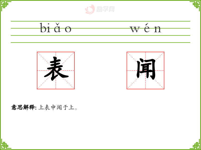 《说文》。朱骏声曰:“古者衣裘,以毛为里。按,古衣裘皆外毛,礼服必加裼衣其上。许所谓上衣也,故曰以毛为田,言有表,则毛在里也。”-表,上衣也。 《礼记·玉藻》-表裘不入公门。 《论语》。皇疏:“谓加上衣也。”-必表而出之。 《庄子·让王》-中绀而表素。