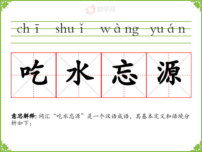 词汇“吃水忘源”是一个汉语成语,其基本定义和语境分析如下: