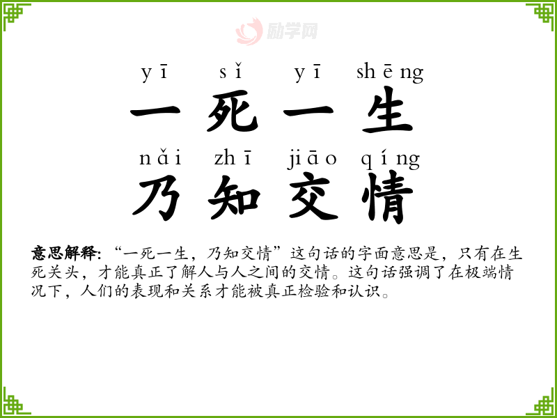 “一死一生,乃知交情”这句话的字面意思是,只有在生死关头,才能真正了解人与人之间的交情。这句话强调了在极端情况下,人们的表现和关系才能被真正检验和认识。