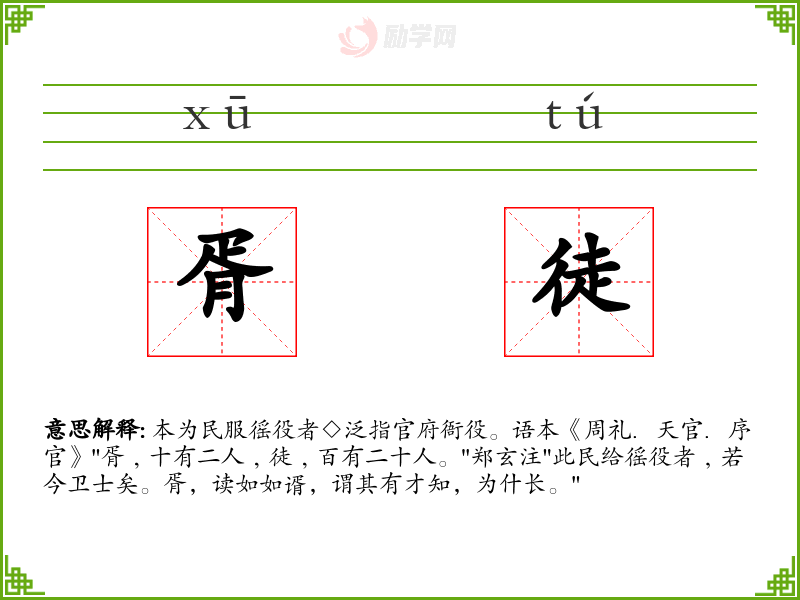 本为民服徭役者◇泛指官府衙役。语本《周礼.天官.序官》"胥﹐十有二人﹐徒﹐百有二十人。"郑玄注"此民给徭役者﹐若今卫士矣。胥,读如如谞,谓其有才知,为什长。"