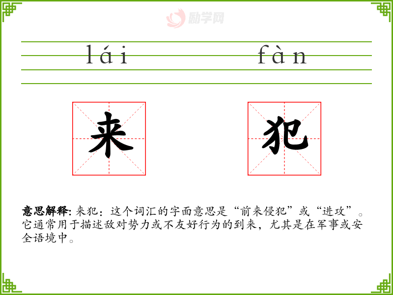 - 专业领域:在军事、国际关系或安全研究中,“来犯”是一个专业术语,用于描述敌对国家的军事行动。