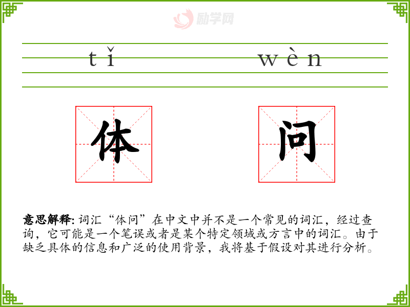 词汇“体问”在中文中并不是一个常见的词汇,经过查询,它可能是一个笔误或者是某个特定领域或方言中的词汇。由于缺乏具体的信息和广泛的使用背景,我将基于假设对其进行分析。