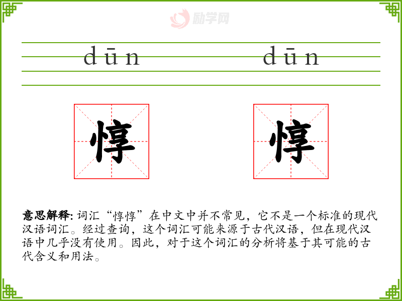 词汇“惇惇”在中文中并不常见,它不是一个标准的现代汉语词汇。经过查询,这个词汇可能来源于古代汉语,但在现代汉语中几乎没有使用。因此,对于这个词汇的分析将基于其可能的古代含义和用法。