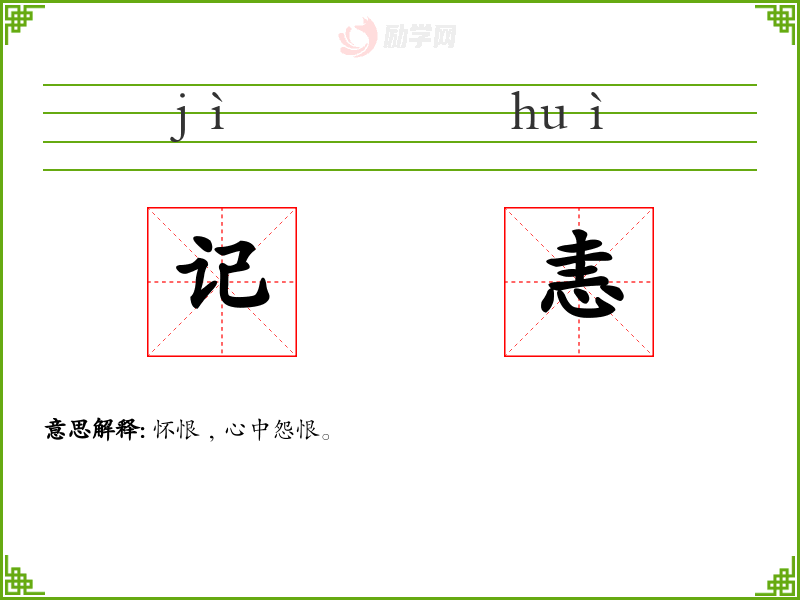 《说文》-记,疏也。 《广雅》-记,识也。 《礼记·内则》-记有成。 《礼记·学记》-记间之学。 《后汉书·应奉传》-凡所经履,莫不暗记。 宋·李清照《如梦令》-常记溪亭日暮。 宋·司马光《训俭示康》-吾记天圣中。 宋·辛弃疾《永遇乐·京口北固亭怀古》-望中犹记。