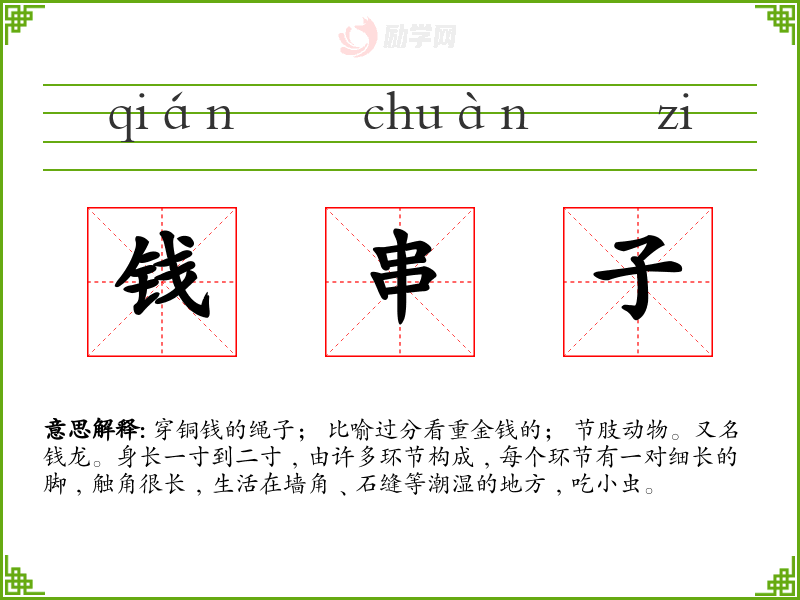穿铜钱的绳子; 比喻过分看重金钱的; 节肢动物。又名钱龙。身长一寸到二寸﹐由许多环节构成﹐每个环节有一对细长的脚﹐触角很长﹐生活在墙角﹑石缝等潮湿的地方﹐吃小虫。
