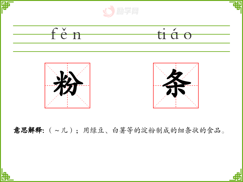 粉条的意思是:(~儿);用绿豆、白薯等的淀粉制成的细条状的食品。