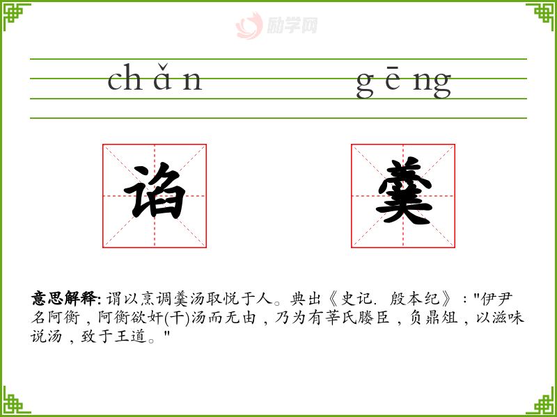 谄羹的意思是:谓以烹调羹汤取悦于人。典出《史记.殷本纪》﹕"伊尹名阿衡﹐阿衡欲奸(干)汤而无由﹐乃为有莘氏媵臣﹐负鼎俎﹐以滋味说汤﹐致于王道。"